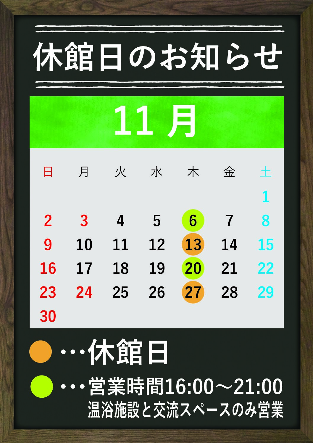 11/13(木)、27(木) ※11/6(木)と11/20(木)は16:00~21:00の間、温浴施設および交流スペースのみ営業します(食堂などは休み) 12/4(木)、11(木)、18(木)、25(木)、30(月)、31(火) 2026/1/1(木)、8(木)、15(木)、22(木)、30(木)